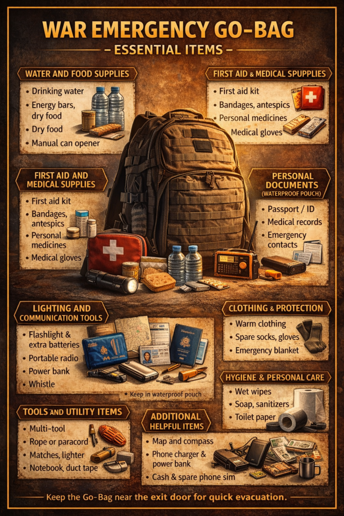 In times of conflict or emergency evacuation, having a prepared emergency kit—commonly called a “Go-Bag”—can make a critical difference in survival and safety. A Go-Bag is a portable bag containing essential items that allow individuals or families to leave quickly and survive independently for at least 48 to 72 hours. In many war or disaster situations, people may have only a few minutes to evacuate their homes, and gathering necessary supplies at the last moment may not be possible. Preparing a ready-to-carry emergency bag ensures that you can move quickly while still having access to vital resources.